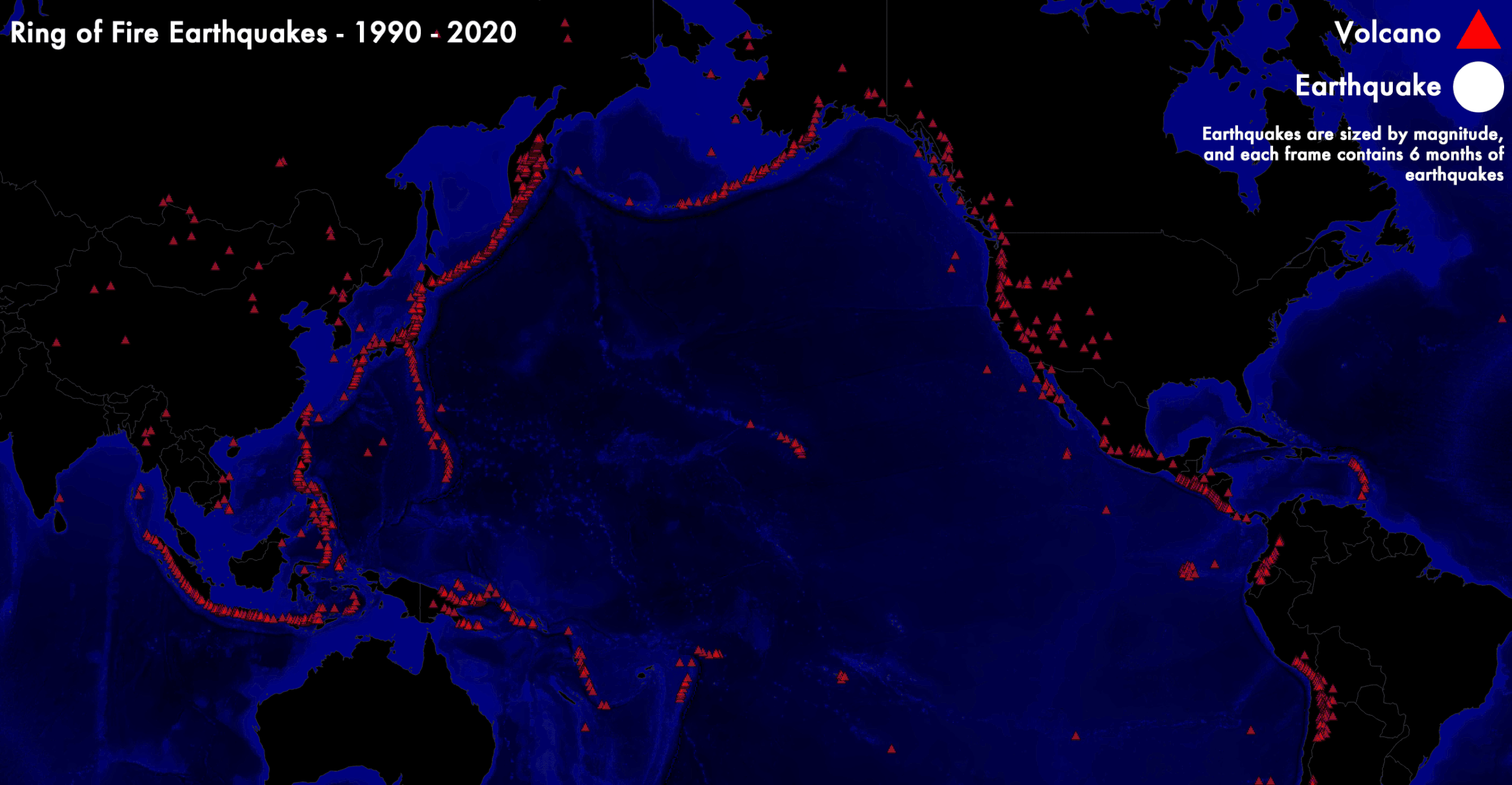 This animation shows 6 months of earthquakes with magnitudes of 5 or greater per frame in the Ring of Fire, starting January 1, 1990 and ending on December 31, 2019. Earthquakes are sized by magnitude: the bigger the circle the stronger the earthquake. This animation helps illustrate that while the entire Ring of Fire is quite active, the majority of activity occurs on the Asian side of the ring. So while the West Coast of the US has the potential for seismic activity, it is less common than other parts of the Ring of Fire.